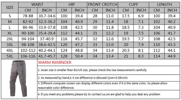 Description: These Tactical Pants are designed for ultimate performance and comfort in outdoor training and tactical situations. The camouflage pattern provides excellent concealment. while the waterproof construction ensures you stay dry in various weather conditions. The tear-resistant material enhances durability. making these pants suitable for rugged environments and intense activities.